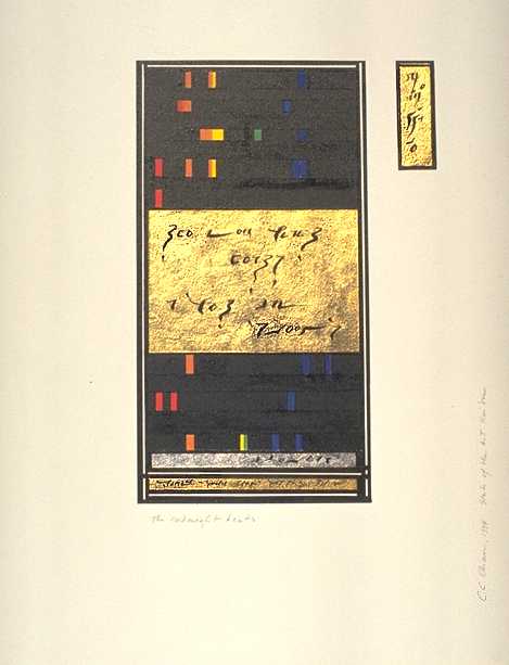 23K gold leaf, pen, brush and ink, coloured pencil, conceptual calligraphy.